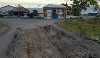 Haltim – Kondisi jalan rusak di depan gerbang Pelabuhan Feri Subaim, Kecamatan Wasile,